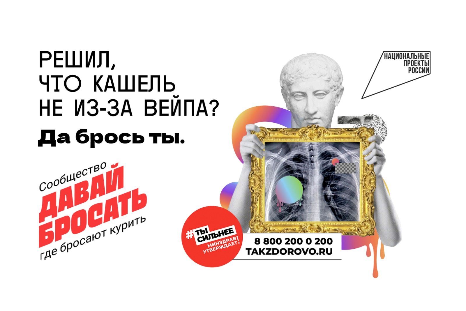 02.05.20241 мая по нацпроекту «Демография» АНО «Национальные приоритеты» совместно с Минздравом России запустило коммуникационную кампанию «Электронные сигареты и что они скрывают». Рекламные баннеры побуждают людей задуматься, так ли безопасны электронные сигареты для здоровья и какие последствия для организма может спровоцировать курение. Решил, что кашель не из-за вейпа? Считаешь, что курение электронных сигарет не вредно и это просто «клубничный пар»? Да брось ты.